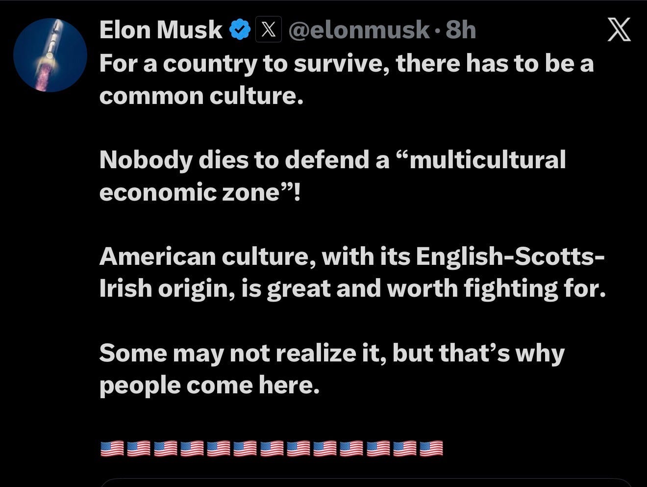 When Elon Musk contrasts a “common culture” with what he calls a “multicultural economic zone,” he invokes a familiar narrative: that America’s cohesion rests on a shared Anglo-American heritage now under threat.